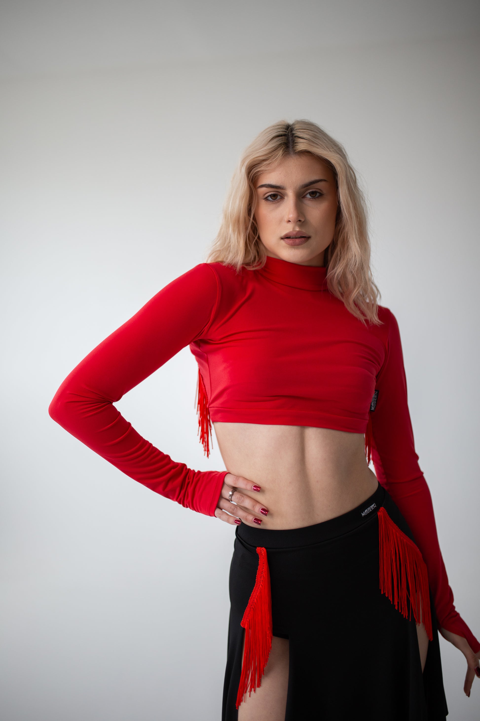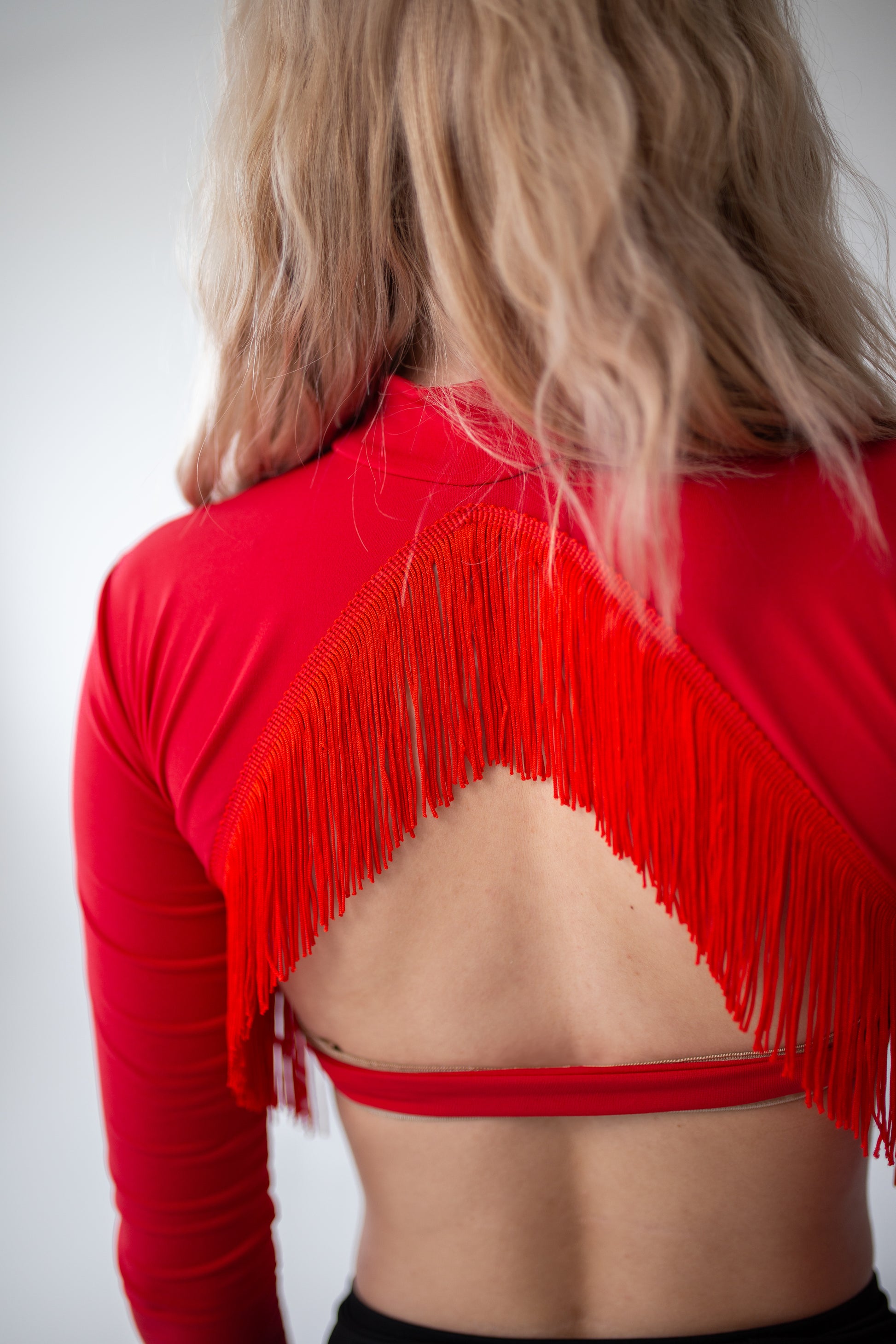 Czerwony top z długimi rękawami i frędzlami